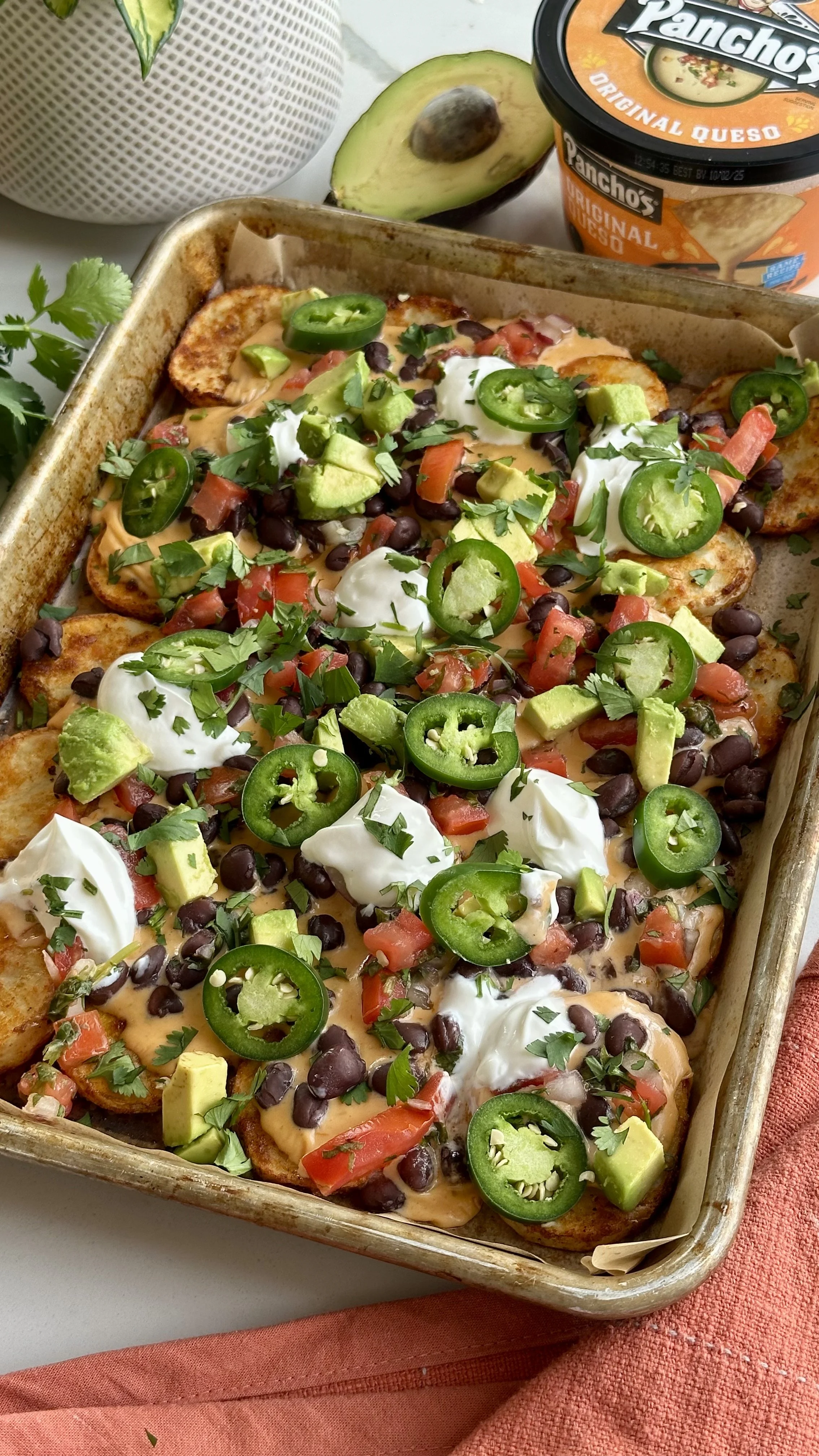 Remove from the oven and add the toppings. Scatter the pico de gallo across the top, add the sour cream in dollops, scatter the avocado and jalapeno, and garnish with the cilantro. Enjoy!